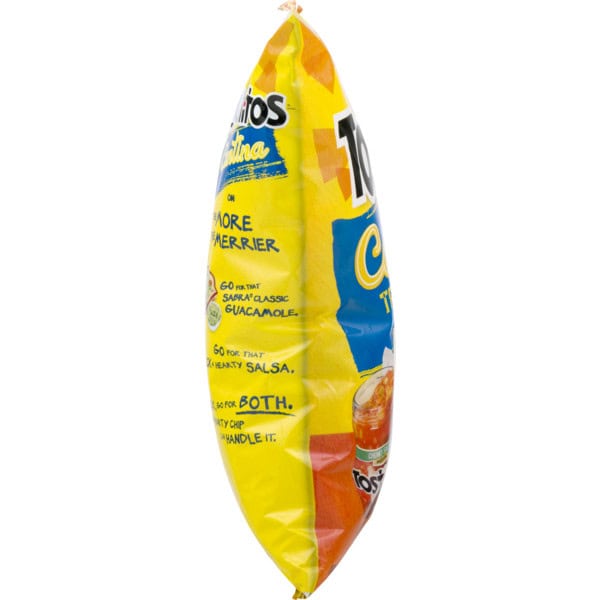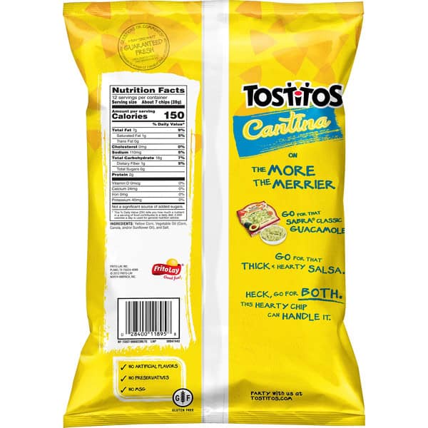 No artificial flavors. Gluten free. Bring the fiesta home. Tostitos Cantina on the more the merrier go for that Sabra classic guacamole. Go fro that thick & hearty salsa, heck, go for both. This hearty chip can handle it. Good fun! No preservatives. No MSG. Questions or comments? 1-800-352-4477 Mon-Fri 9:00am to 4:30pm CT/email or chat at fritolay.com. Party with us at tostitos.com.