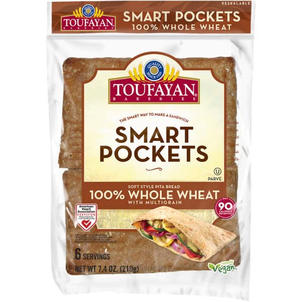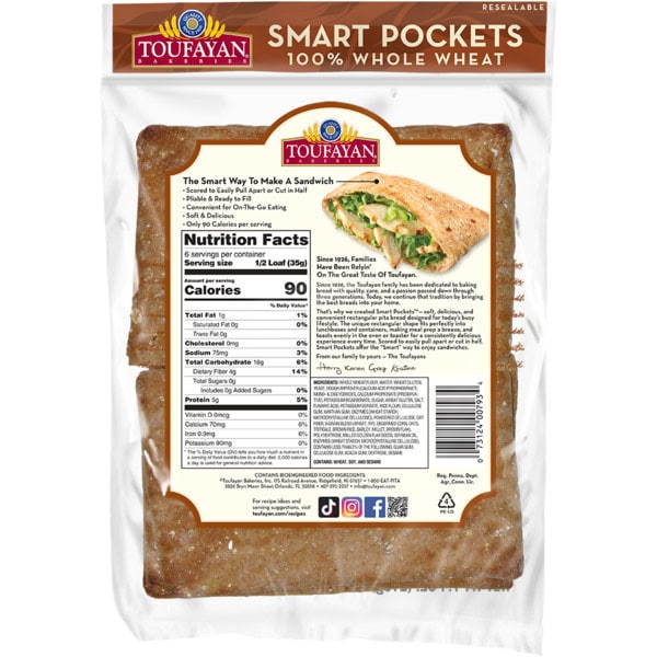 With multigrain. 100 calories per serving. 0 g Trans fats per serving. 4 g fiber per serving. 5 g protein per serving. Only 100 calories. Low sodium. New & improved. Quality since 1926. The new way to make a sandwich. The better way to make a sandwich. Soft & Pliable. Convenient for On-The-Go Eating. Nutritious & Delicious. Since 1926, Families Have Been Relyin’ on The Fresh Taste of Toufayan. In 1926, The Toufayan family’s passion of baking bread with quality and care began. Three generations later we still have that passion to bring the best breads to our customers’ home. When our customers asked for a more ‘user friendly’ and healthy Pita to make sandwiches, we set out to ‘Reinvent’ the Pita! That’s why we introduced ‘Smart Pockets’. It is the most wholesome, convenient, and soft pocket pita bread for the needs of today’s consumer. Please enjoy, ‘The ‘Smart’ way to make a sandwich’. From our family to yours, Herry Karen Grey Kristine. Instagram. Twitter. Facebook. For recipe ideas and serving suggestions, visit www.toufayan.com/recipes. Easy open.