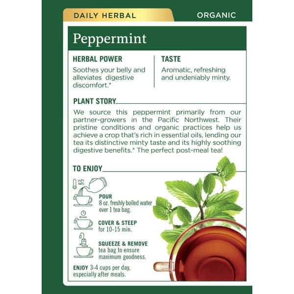We source this peppermint primarily from our partner-growers in the Pacific Northwest. Their pristine conditions and organic practices help us achieve a crop that’s rich in essential oils, lending our tea its distinctive minty taste and its highly soothing digestive benefits.* The perfect post-meal tea!