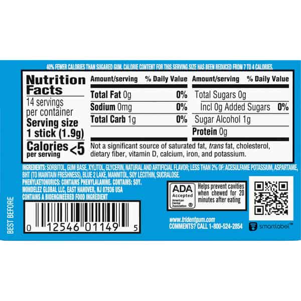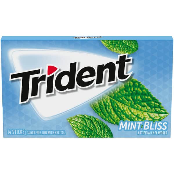 Trident Mint Bliss Sugar Free Gum is a delicious way to freshen breath and protect your teeth. With 30% fewer calories than sugared gum, Trident gum is sweetened with xylitol, a naturally occurring sugar alcohol. Chewing Trident chewing gum after eating and drinking cleans and protect teeth. Bulk mint gum packs give you plenty to stock your home or workplace. One 14 piece package of Trident Mint Bliss Sugar Free Gum (packaging may vary). Mint Bliss flavor sugar free chewing gum. Helps clean and protect teeth while providing fresh breath. Made with xylitol. Chewing Trident after eating and drinking cleans and protect teeth.