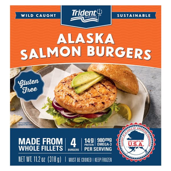 Per Serving: 14 g protein; 980 mg omega-3. Caught in Alaska by American Fishermen: Wild caught in the U.S.A. Delicious. Wild, natural & sustainable. Made from whole fillets. Our Personal Guarantee: Our salmon burger is made from whole fillets of wild caught Alaska salmon which are caught by independent hard-working fishermen, who make their living plying the waters of Alaska. It is shining example of Trident Quality and we are proud to put our name on every package. We do not use any fillers, or by-products. Seasoned to perfection, the Alaska salmon burger is a simple and convenient way to enjoy Alaska salmon anytime and we are proud to put our name on every package. We’re as serious about customer satisfaction as we are about seafood and would love to hear from you, please drop us a line, – Chuck and Joe Bundrant, Trident Seafoods from our family to yours since 1973. www.TridentSeafoods.com. Follow us: Facebook. Twitter. YouTube. Instagram. Want to learn more? Scan code to find out about where this fish is caught and our commitment to sustainability, traceability and social responsibility. Questions or comments? We’d love to hear from you! Please keep your packaging and contact our Consumer Affairs team: Toll-free 1-866-413-4749 or by email at ConsumerAffairs(at)TridentSeafoods.com.