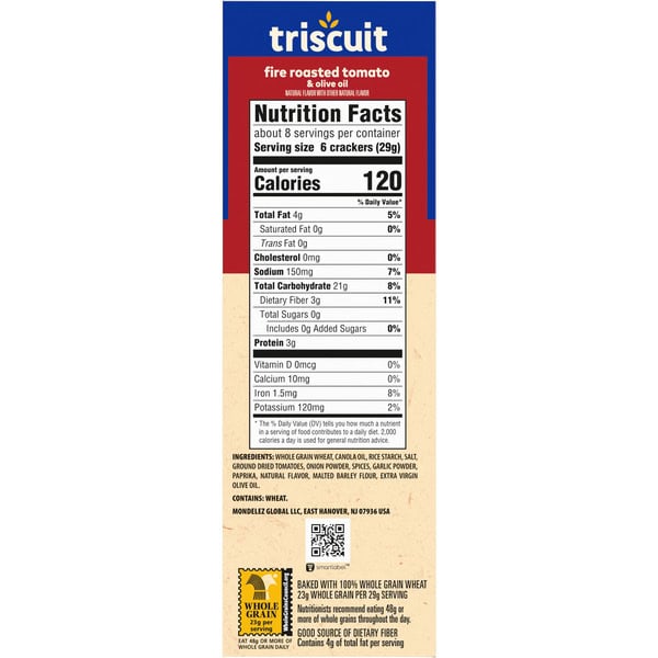 Triscuit Fire Roasted Tomato & Olive Oil Whole Grain Wheat Crackers are made simply with quality ingredients. Baked to perfection, these snack crackers use 100% whole grain wheat proudly grown in the USA and sunflower oil. These crackers have their signature woven texture, are Kosher, Non-GMO, have no artificial colors or flavors and are a good source of dietary fiber (see nutritional information for fat content).