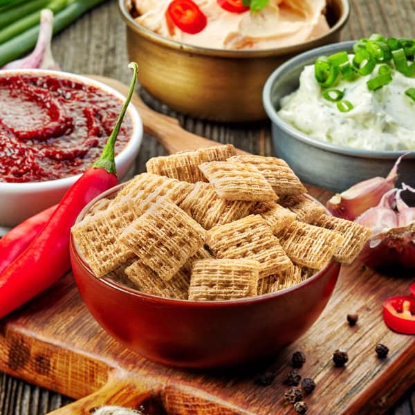 • Baked kosher snacks feature a hearty, crunchy woven texture making them a great addition to your snack mix.