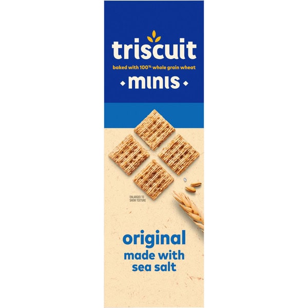 Triscuit Mini Original Whole Grain Wheat Crackers are made simply with quality ingredients. Baked to perfection, these vegan snack crackers use 100% whole grain wheat proudly grown in the USA, oil, and sea salt for a classic flavor. The bite-sized square snack crackers are made with their signature woven texture for a satisfying crunch. Mini Triscuit crackers are vegan, Non-GMO Project Verified, made without artificial colors or flavors and a good source of dietary fiber (see Nutrition information for fat content). Serve on your meat and cheese tray or create a simple snack mix with pretzels and nuts.