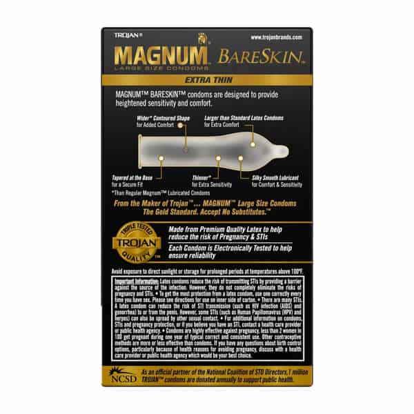 Trojan Magnum Bareskin Large Size Condoms. The Gold Standard in comfort and protection. Accept No Substitutes. These are the thinnest Magnum condom from Trojan, designed to provide heightened sensitivity and comfort. They are larger than the standard condom with a wider, contoured shape for added comfort, while the tapered base ensures a secure fit. Silky smooth lubricant ensures a natural feel and sensitivity. They’re made from a premium quality latex and are electronically tested to help ensure reliability. These condoms reduce the risk of unintended pregnancy and sexually transmitted infections (STIs) while you play. For extra safety, there is a special reservoir end. Accept No Substitutes. Includes one 10 count box of Trojan Magnum Bareskin Large Size Condoms. Trojan Brand condoms are America’s #1 condom, trusted for over 100 years. The TROJAN Brand promotes a safe, healthy, and fun sex life. From condoms to vibrators to lubricants, Trojan Brand is dedicated to delivering innovative, high-quality products that offer pleasure and protection.