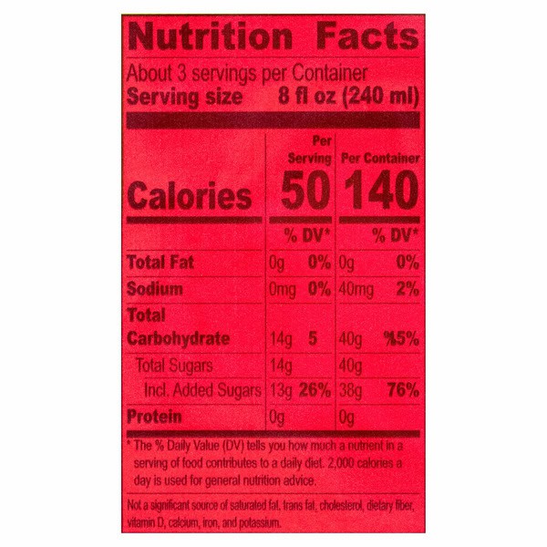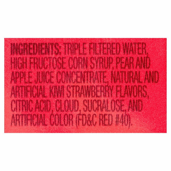Triple Filtered Water, High Fructose Corn Syrup, Pear And Apple Juice Concentrate, Natural And Artificial Kiwi Strawberry Flavors, Citric Acid, Cloud, Sucralose, Artificial Color (fd&c Red #40)