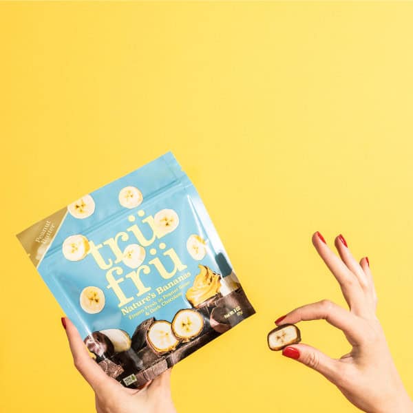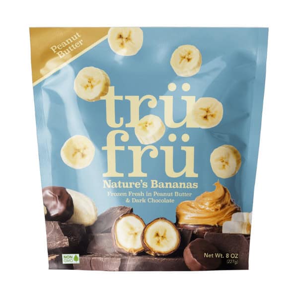 Frozen fresh in peanut butter & dark chocolate. Gluten free. Non-GMO. Nature’s Bananas: Picked ripe. Frozen Fresh: Captures natural ripeness. Immersed in peanut butter & dark chocolate. Hyperchilled: Locks in flavor & nutrition. Nature’s Fruit in chocolate. trufru.com. Questions or Comments? 1-888-437-2497; trufru.com.