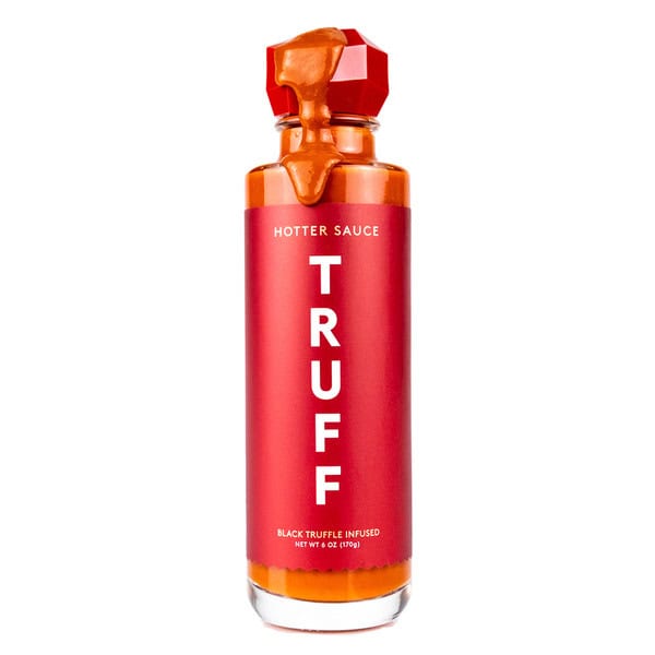 TRUFF® Hotter Blend (Red Chili Peppers, Water, Vinegar, Organic Sugar, Garlic, Salt, Black Truffle [Tuber Melanosporum]), Olive Oil Infused with Black Truffle Essence, Organic Agave Nectar, Red Habanero Powder, Lycopene and Glycerin (for color), Spices, Xanthan Gum