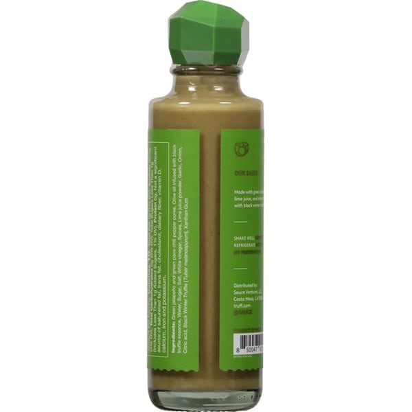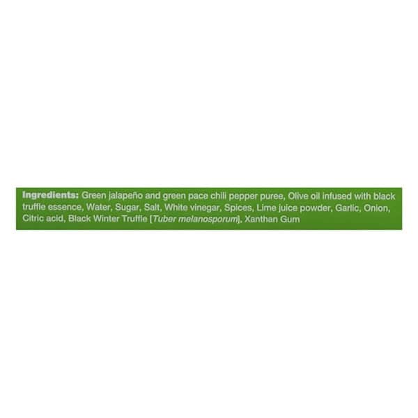 Green jalapeño and green pace chili pepper puree, Olive oil infused with black truffle essence, Water, Sugar, Salt, White vinegar, Spices, Lime juice powder, Garlic, Onion, Citric acid, Black Winter Truffle [Tuber melanosporum], Xanthan Gum