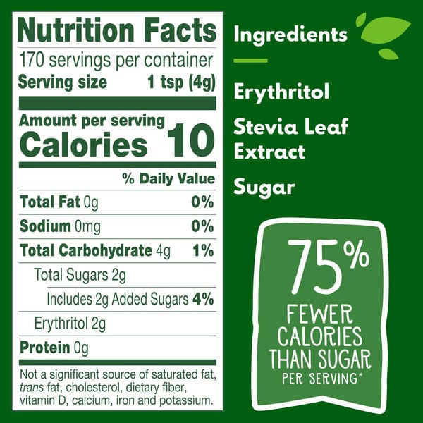 Sweetness is meant to be enjoyed. That’s why Truvia created products meant to reduce sugar, not taste. The clean, sweet flavor contained in Truvia Original Calorie-Free Sweetener comes from nature in the form of the stevia leaf. Because leaves don’t dissolve well in most of your favorite recipes, we extract the flavor from the stevia leaf and balance its rich sweetness with erythritol, a sweetener produced by fermentation. Erythritol is also found in fruits like grapes and pears. This gives you the white crystals you’re used to with fewer calories. Truvia Cane Sugar Blend is a mix of Truvia Original Calorie-Free Sweetener and cane sugar, so it bakes and browns like sugar but with 75% fewer calories per serving than sugar. This 24-ounce (1.5-pound) bag comes with a twist off cap and pour-spout for easy use and simple storage.