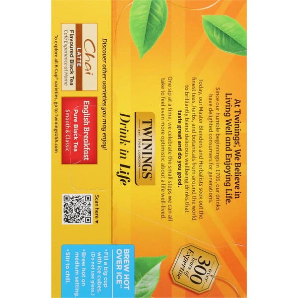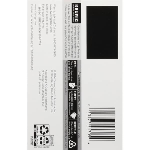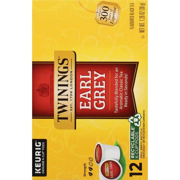 Twinings of London. Est. 1706. 216 The Strand, London WC2, England. Earl Grey: Twinings has been blending my family tea for years. Legend has it that my ancestor, the second Earl Grey, was presented with this exquisite recipe by on envoy on his return from China. He liked it so much, he asked Richard Twining to recreate it for him. Generations of my family have enjoyed Earl Grey tea and today, I am proud to continue this tradition with the tea celebrated throughout the world known as Twinings Earl Grey. Grey – The seventh Earl Grey. At Twinings, we take great care to ensure that the Earl Grey tea you drink today tastes as extraordinary as the one Richard Twining first recreated. Fresh, fragrant and flavoured with distinctive notes of citrus, this Earl Grey tea has all the taste of the original. Mike Wright-Master Blender. Over 300 years of experience. www.Twinningusa.com. www.Keurig.com. Find us on Facebook.com/Keurig or Twitter.com/Keurig. For questions or comments, please contact us at: Twinings North America, Inc. www.twiningsusa.com/1-800-803-6695. For brewer inquiries contact: 1-866-901-Brew/1-866-901-2739; www.Keurig.com. Sourced with care. Twinings of London. Sourced with care. Improving quality of life in the communities we source from www.sourcedwithcare.com. Infuse your life with flavour. Available in a wide variety of Black, Green, Herbal and Chai Latte K-Cup pods. This carton is recyclable. Printed in the U.S.A. Twinings of London Sourced with CareĂ–Sourced with CareĂ–Improving quality of life in the communities we source from.www.sourcedwithcare.com; Earl GreyTwinings has been blending my family tea for years. Legend has it that my ancestor, the second Earl Grey, was presented with this exquisite recipe by an envoy on his return from China. He liked it so much, he asked Richard Twining to recreate it for him. Generations of my family have enjoyed Earl Grey tea and today, I am proud to continue this tradition with the tea celebrated throughout the world known as Twinings Earl Grey.”Ă¹GreyThe Seventh Earl Grey; At Twinings, we take great care to ensure that the Earl Grey tea you drink today tastes as extraordinary as the one Richard Twining first created. Fresh, fragrant and flavoured with distinctive notes of citrus and bergamot, this Earl Grey tea has all the taste of the original.Mike WrightĂ¹Master Blender