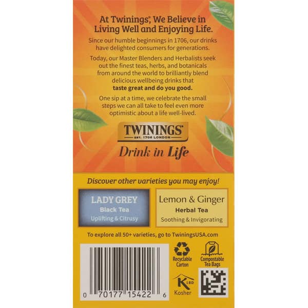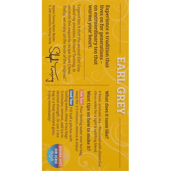By appointment to her Majesty Queen Elizabeth II tea and coffee merchants R. Twining and Company Limited, London. Twinings of London. Estd 1706. The Strand, London WC2, England. Brighten up your day with the distinctive taste and aroma of this classic tea. Individual tea bags sealed for freshness. The Twinings of London Story: In 1706, Thomas Twining began selling fine tea from an English storefront in The Strand, London. Today, Twinings continues to sell some of the world’s best teas from the original store and in more than 100 countries throughout the world. Over 300 years of experience. Est. 1706. Master Blender’s Notes: Notes: Fragrant, flora, citrusy. Colour: Translucent, reddish-brown. Sleep Time: 3 minutes (Recommended). Twinings has been blending my family tea for years. Legend has it that my ancestor, the second Earl Grey, was presented with this exquisite recipe by an envoy on his return from China. He liked it so much, he asked Richard Twining to recreate it for him. Generations of my family have enjoyed Earl Grey tea and today, I am proud to continue this tradition with the tea celebrated throughout the world known as Twinings Earl Grey. – The seventh Earl Grey. At Twinings, we take great care to ensure that the Earl Grey tea you drink today tastes as extraordinary as the one Richard Twining first recreated. Fresh, fragrant and flavoured with distinctive notes of citrus, this Earl Grey tea has all the taste of the original. – Mike Wright – Master Blender. Ethical tea partnership.