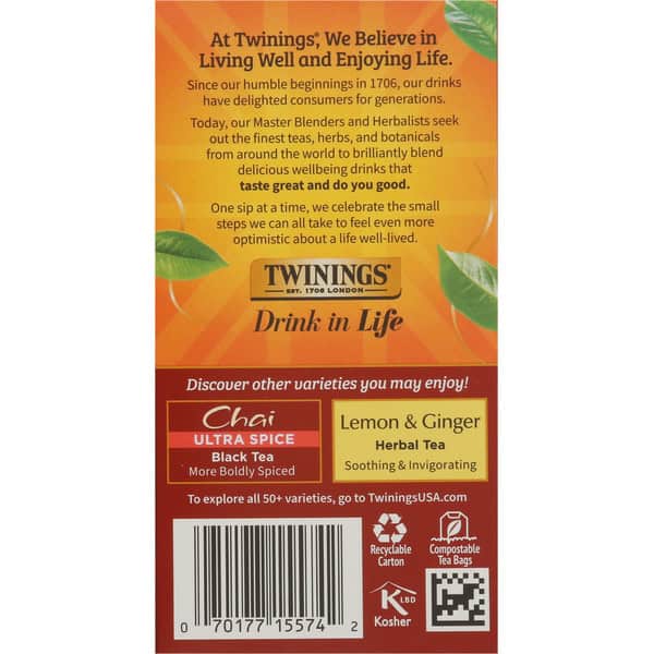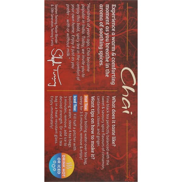 For over 300 years, Twinings has been sourcing and blending the finest, high-quality teas from around the globe to ensure that your tea has the perfect balance of tea taste, flavour and aroma. Twinings blends to perfection the finest black teas with the sweet and savoury spice flavours of cinnamon, cardamom, cloves and ginger to give you a line of great-tasting Chai teas with a bold, spicy taste and rich, vibrant aroma.