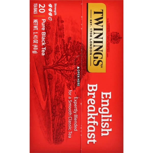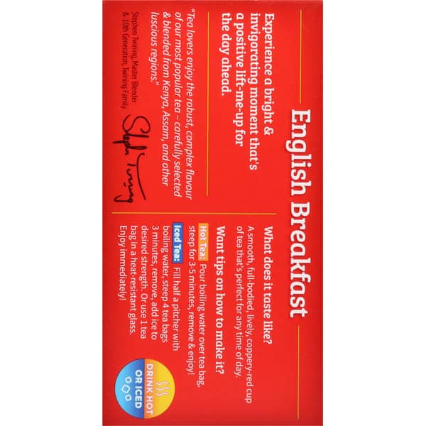 Non GMO Project verified. nongmoproject.org. By appointment to her Majesty Queen Elizabeth II. Tea and Coffee Merchants R. Twining and Company Limited, London. 20 individual tea bags sealed for freshness. Enjoy the smooth, full-bodied taste of this classic tea any time of the day. Tea Profile: Strength. Notes: Smooth, flavorful, robust. Origins: Malawi, Kenya and Assam. The Twinings of London Story: In 1706, Thomas Twining began selling fine tea from an English storefront in The Strand, London. Today, Twinings continues to sell some of the world% best teas from the original store and in more than 100 countries throughout the world. Over 300 years of experienced. Est. 1706. Master Blender’s Notes: Notes: Smooth, flavorful, robust. Colour: Bright, coppery-red. Strength. Sleep Time: 4 minutes (Recommended). English Breakfast is our most popular tea. To create this well-balanced blend, we select some of the finest teas each with its own unique characteristics. Tea from Kenya and Malawi, provides the briskness and coppery red colour while Assam gives full body and flavour. The robustness from these regions is complemented by softer teas from other regions. This combination yields a complex, full bodied, lively cup of tea that is perfect any time of day. – Jeremy Sturges, Master Blender. www.twiningsusa.com To discover more about these fine teas, please visit us at www.twiningsusa.com. For questions or comments. Please contact us at: www.triningsusa.com or call us at 1-800-803-6695. Find out about our membership of: www.ethicalteapartnership.org. Working for a responsible tea industry. Explore the entire world of Twinings 100% pure black teas. Tea Blend: Ceylon Orange Pekoe; Strength: 3; Notes: Bright crisp, refreshing. Tea Blend: English Afternoon; Strength: 3; Notes: Smooth, refreshing, slightly sweet. Tea Blend: English Breakfast; Strength: 3; Notes: Smooth, flavourful, robust. Tea Blend: Irish Breakfast; Strength: 4; Notes: Thick, malty, full-bodied. Tea Blend: Lapsang Souchong; Strength 4; Notes: Smoky, pungent, Woody. Tea Blend: Prince of Wales; Strength: 2; Notes: Soft, Smooth, Mild. Enjoy all 50 varieties of Twinings Premium Teas. Black, Green, Herbal, Chai, K-Cup Packs, Organi & Fair Trade Certified, Cold Brewed Ice Tea.