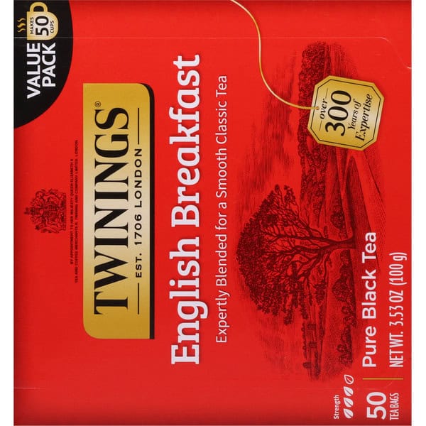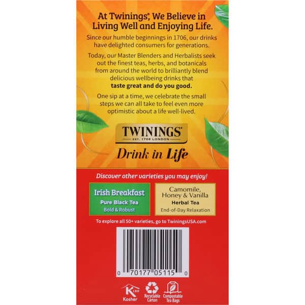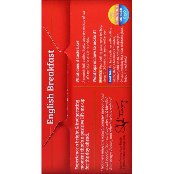 English Breakfast is our most popular tea, and the Twinings English Breakfast Pure Black Tea Bags are no exception. To create this well-balanced blend, we select some of the finest teas, each with its own unique characteristics. Tea from Kenya and Malawi provides the briskness and coppery-red colour while Assam gives full-body and flavour. The robustness from these regions is complemented by softer teas from other regions. The combination yields a complex, full-bodied, lively cup of tea that is perfect any time of day and helps you feel good inside and out . To brew the perfect cup, steep one tea bag for 5 minutes in boiling water. At Twinings, we believe in living well and enjoying life. Backed by generations of trusted knowledge and ethical integrity, our Master Blenders are committed to delivering nature’s goodness and ensuring consistent taste and quality by sourcing the world’s finest herbs, fruits, and teas. From traditional teas to functional blends, Twinings encourages consumers to “Drink in Life” by celebrating the small steps that make wellbeing attainable and remain committed to an optimistic life that is well-lived, one sip at a time.