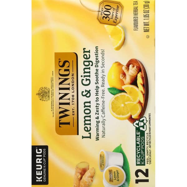 Today the expert blenders at Twinings have combined these two great flavours into the Twinings Lemon & Ginger K-Cup Pods for Keurig for a lively and enjoyable caffeine free herbal tea experience that helps you feel good inside and out . To brew the perfect cup, use a Keurig or other single-serve brewer; For hot tea, select the 6 oz. or 8 oz. brew button for optimal flavour; For Iced Tea brew over a tumbler of ice using the 8 oz. option. Herbs have a long history of documented use tracing back to Ancient Egypt, Ancient China and to the beginning of Ayurveda science in India. Herbal teas can be made from any combination of flowers, leaves, seeds, roots, citrus or berry fruits herbs and spices-which is why the number of unique blends available is virtually limitless. Camomile, Peppermint, Ginger and Hibiscus are some of the most popular ingredients used today. The zesty citrus flavour of lemon has been invigorating the tea experience for hundreds of years. Chinese herbalists were known to use the pungent taste of ginger in tea over 2500 years ago. At Twinings, we believe in living well and enjoying life. Backed by generations of trusted knowledge and ethical integrity, our Master Blenders are committed to delivering nature’s goodness and ensuring consistent taste and quality by sourcing the world’s finest herbs, fruits, and teas. From traditional teas to functional blends, Twinings encourages consumers to “Drink in Life” by celebrating the small steps that make wellbeing attainable and remain committed to an optimistic life that is well-lived, one sip at a time.