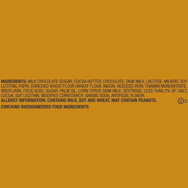 Milk Chocolate (sugar, Cocoa Butter, Chocolate, Skim Milk, Lactose, Milkfat, Soy Lecithin, Pgpr, Artificial Flavors), Enriched Wheat Flour (wheat Flour, Niacin, Reduced Iron, Thiamine Mononitrate, Riboflavin, Folic Acid), Sugar, Palm Oil, Corn Syrup, Skim Milk, Dextrose, Less Than 2% – Salt, Cocoa Powder, Soy Lecithin, Modified Corn Starch, Baking Soda, Artificial Flavor.