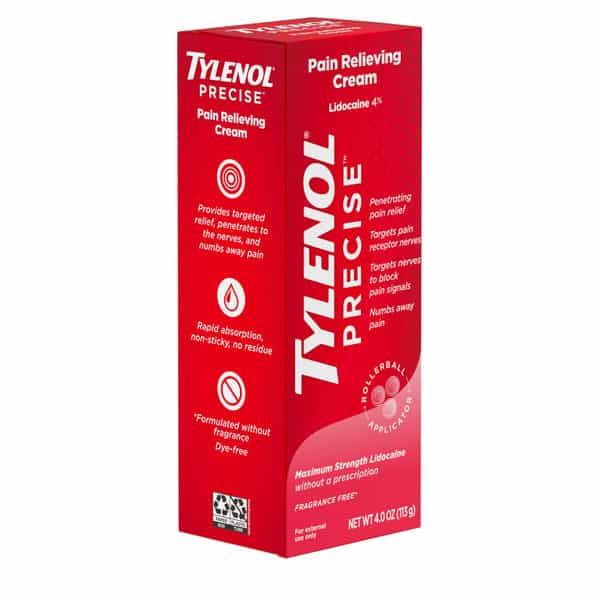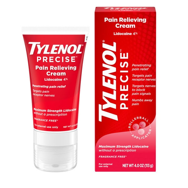 Tylenol Precise Pain Relieving Cream provides penetrating pain relief to help numb minor joint and muscle soreness. Formulated with maximum strength lidocaine without a prescription, this pain relieving cream targets pain receptor nerves to block pain signals and provide numbing relief from muscle aches and pains. It’s ideal for use on the back and shoulders, legs and hips, knees, elbows and ankles, and other small joints. The fast-absorbing, non-sticky cream is fragrance- and dye-free and won’t leave any residue behind on skin or clothes. For easy, mess-free application, the topical analgesic includes a massaging rollerball applicator. To use, adults and children 12 and older should apply the pain relief cream to affected areas no more than three to four times daily.