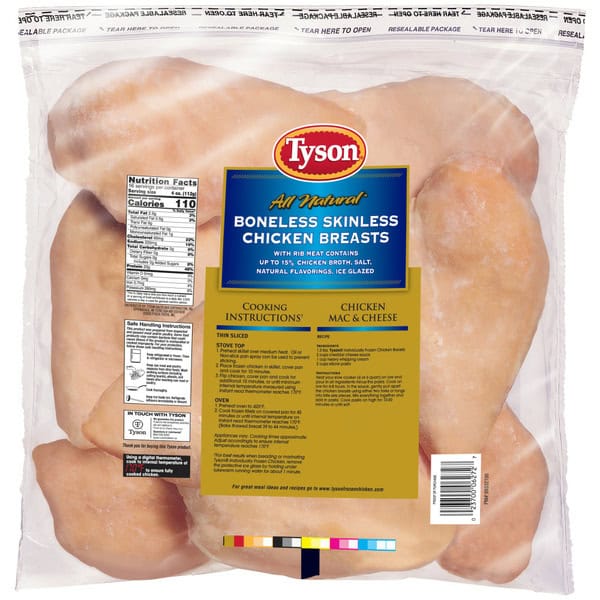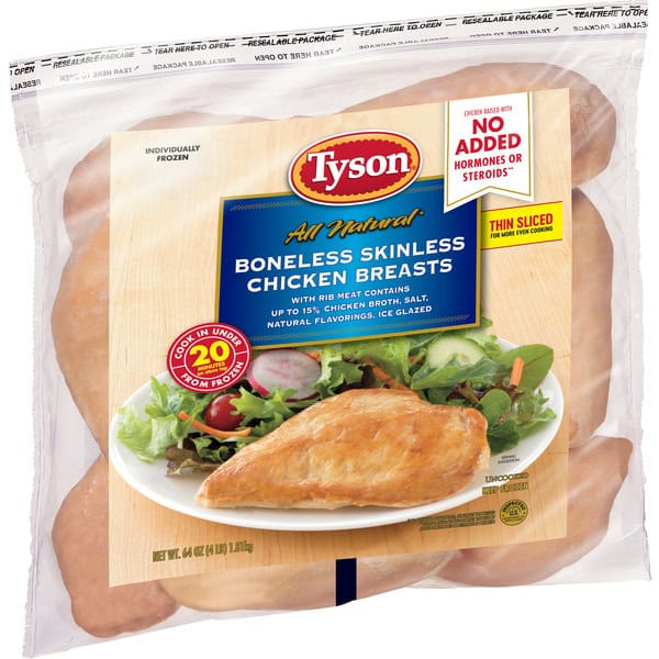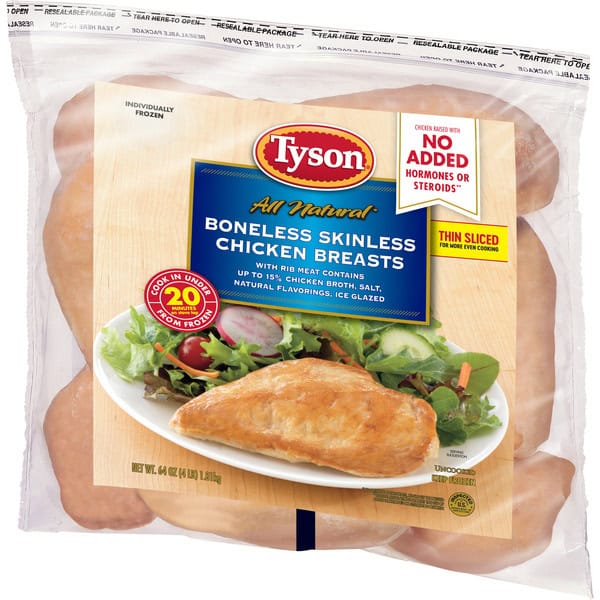 There’s nothing like cooking from scratch, especially when you start with Tyson Individually Frozen Boneless Skinless Chicken Breasts. Our all-natural* chicken is juicy and tender with 23 grams of protein and 0 grams of trans fat per serving. Perfect for grilling and roasting, simply cook and serve our boneless chicken breasts with BBQ sauce for a quick and delicious weeknight dinner. Includes one 4 lb package of individually frozen chicken. Everything seems to turn out a whole lot better when you just keep it simple. No nonsense. Just stick to the good stuff. The 100% real stuff that makes life, and chicken, great. . Keep it real. Keep it Tyson. *Minimally processed, no artificial ingredients., One 4 lb. package of individually frozen Boneless Skinless Chicken Breasts, All-natural, minimally processed chicken with no artificial ingredients, 23 grams of protein and 0 grams of trans fat per serving, Resealable bag for easy storage, Perfect for grilling and roasting