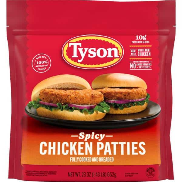 Tyson Frozen Fully Cooked Spicy Chicken Patties are a delicious addition to any meal. Our chicken patties are made with no preservatives, then breaded with a kick of spice. With 0 grams of trans fat per serving, these chicken patties are perfectly sandwich sized for a quick lunch or dinner. Fully cooked and ready-to-eat, simply prepare in an oven or microwave and serve with ketchup on a sesame seed bun for a delicious lunch. Includes one 26 oz package. Everything seems to turn out a whole lot better when you just keep it simple. No nonsense. Just stick to the good stuff. The 100% real stuff that makes life, and chicken, great. . Keep it real. Keep it Tyson. *Minimally processed, no artificial ingredients.