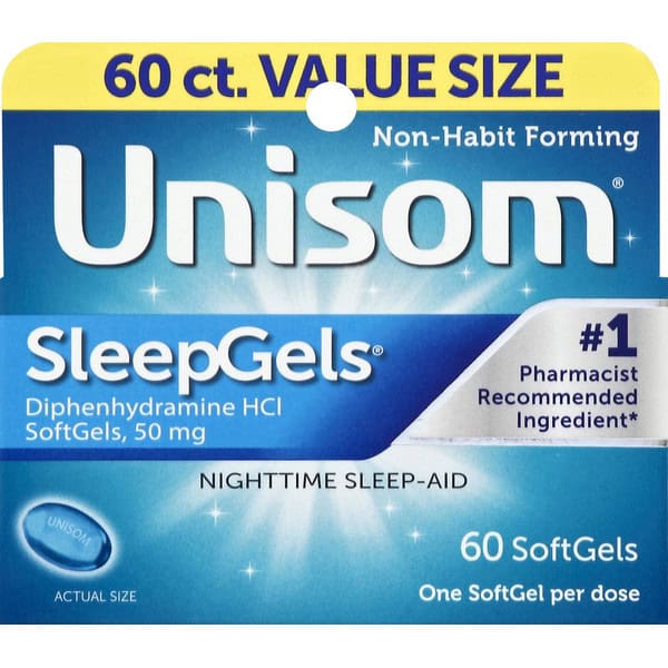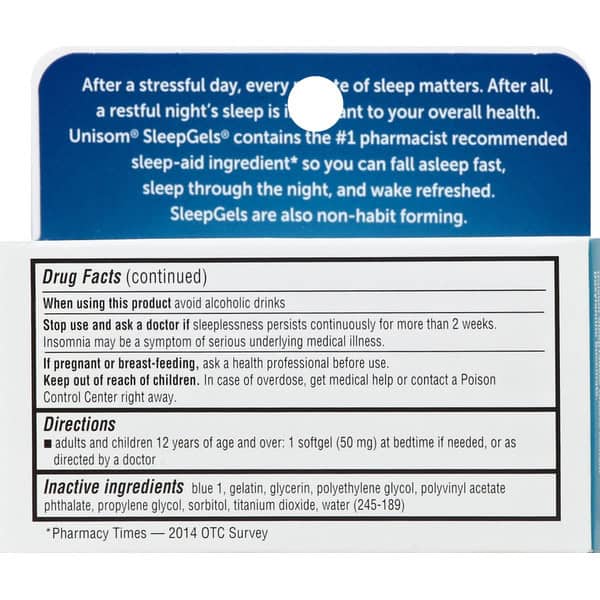 Diphenhydramine HCl softgels, 50 mg. Non-habit forming. No. 1 Pharmacist recommended ingredients (Pharmacy Times – 2014 OTC Survey). After a stressful day, every minute of sleep matters. After all, a restful night’s sleep is important to your overall health. Unisom SleepGels contains the No.1 Pharmacist recommended sleep-aid ingredient (Pharmacy Times – 2014 OTC Survey) so you can fall asleep fast, sleep through the night, and wake refreshed. SleepGels are also non-habit forming. www.Unisom.com.