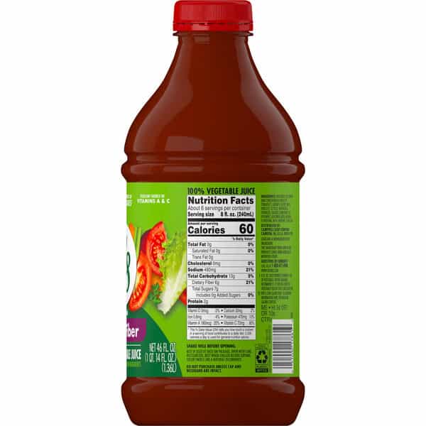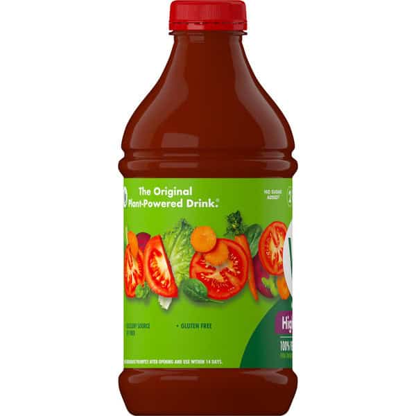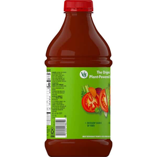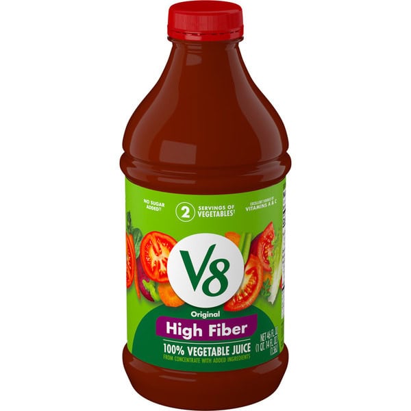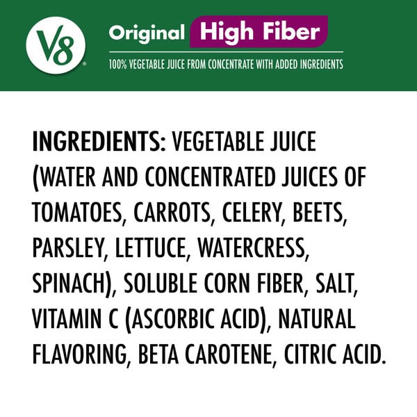 Savor the plant based goodness of V8® High Fiber Original 100% Vegetable Juice. A satisfying alternative to other juices, this high fiber V8® juice is made with concentrated tomato juice along with the juices of seven other vegetables. The result is a 100% juice with a distinctly rich, savory flavor and 6 grams of dietary fiber per serving. Delicious and nutritious, V8® vegetable juice is an easy way to help get your daily recommended veggies. Each 8 fl oz serving contains 2 servings of vegetables and is an excellent source of Vitamins A and C and fiber. Our veggie juice is also gluten free with no sugar added.* Enjoy this high fiber drink on its own, over ice, or seasoned with pepper and adorned with your favorite garnishes. It’s great as a breakfast drink, afternoon snack, or post workout drink. In addition to sipping it as a vegetable drink, you can also use V8® to add flavor and nutrition to a variety of dishes. Try it as a vegetable soup base, substitute it for broth in stews, or use it as a marinade. (*Not a low calorie food; see nutrition panel for sugar and calorie content)