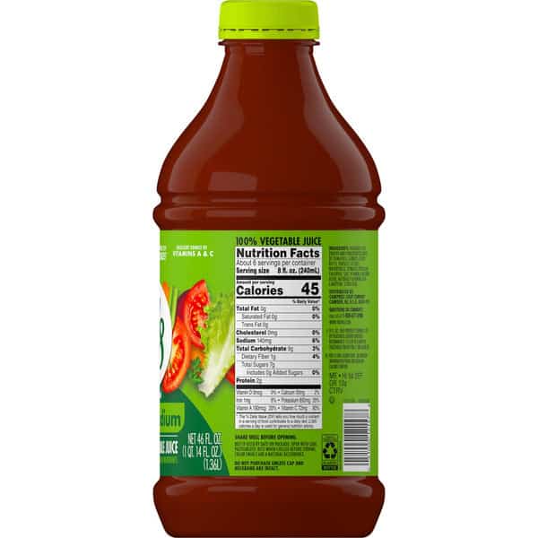 Vegetable Juice (water And Concentrated Juices Of Tomatoes, Carrots, Celery, Beets, Parsley, Lettuce, Watercress, Spinach), Potassium Chloride, Salt, Vitamin C (ascorbic Acid), Natural Flavoring, Beta Carotene, Citric Acid