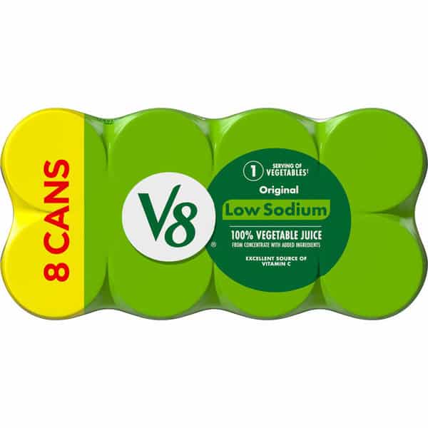 Savor the plant based goodness of V8® Low Sodium Original 100% Vegetable Juice. A satisfying alternative to other juices, low sodium V8® juice is made with concentrated tomato juice along with the juices of seven other vegetables. The result is a 100% juice with a distinctly rich, savory flavor and 78% less sodium than the original. Delicious and nutritious, V8® vegetable juice is an easy way to help get your daily recommended veggies. Each 5.5 fl oz can contains 1 serving of vegetables and is an excellent source of Vitamin C. Our veggie juice is also gluten free and non GMO with no sugar added.* Enjoy V8® on its own straight from the can, over ice, or seasoned with pepper and adorned with your favorite garnishes. It’s great as a breakfast drink, afternoon snack, or post workout drink. With our single-serve cans and bottles, taking the nutrition of V8® vegetable drink on the go has never been easier. (*Not a low calorie food; see nutrition panel for sugar and calorie content)