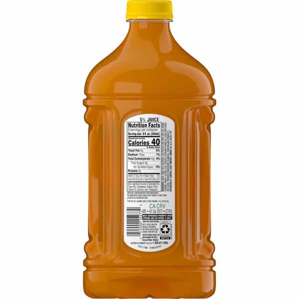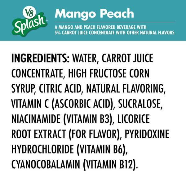 Quench your thirst with the refreshing taste of V8 Splash® Mango Peach Flavored Juice Beverage. This 5% juice blend is made from concentrated carrot juice with the natural flavors of mango and peach for a tasty drink with a satisfying splash of delicious fruit flavor. V8 Splash® Mango Peach juice beverage contains 25% less sugar than leading juice drink brands,* plus Antioxidant C and B Vitamins. It’s also gluten free and fat free. With only 50 calories per serving, V8 Splash® is a lower calorie alternative to orange juice and apple juice. Serve a cold glass of this fruit flavored drink in the morning or as part of an after-school snack. V8 Splash® is also delicious in homemade smoothies and makes a great mocktail or cocktail mixer. In addition to Mango Peach, V8 Splash® Juice is also available in Strawberry Kiwi, Fruit Medley, and other refreshing fruit flavors. (*Per 8 fl oz: Leading shelf stable brands, 17g; Splash, 10g)
