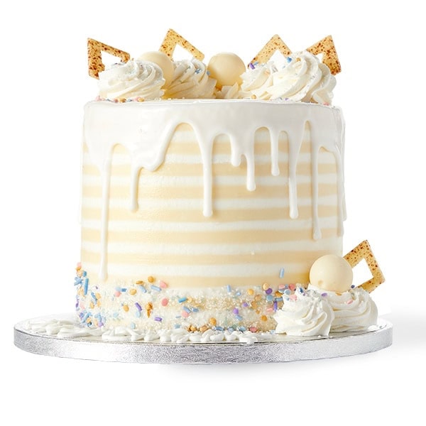 Details Six layers of vanilla cake filled and iced with alternating cream cheese and buttercream icing. Elegantly decorated with white chocolate candies, and white icing drip.