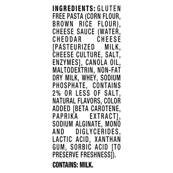 Gluten Free Pasta (corn Flour, Brown Rice Flour), Cheese Sauce (water, Cheddar Cheese [pasteurized Milk, Cheese Culture, Salt, Enzymes], Canola Oil, Maltodextrin, Non-fat Dry Milk, Whey, Sodium Phosphate, Contains 2% Or Less Of Salt, Natural Flavors, Color Added [beta Carotene, Paprika Extract], Sodium Alginate, Mono And Diglycerides, Lactic Acid, Xanthan Gum, Sorbic Acid [to Preserve Freshness]).