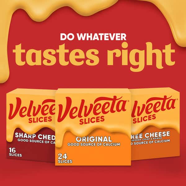 Made with real milk, our craveable individually-wrapped slices of Velveeta cheese are a good source of calcium. Each package contains 24 Velveeta cheese slices. When your drip is as smooth as ours, you don’t waste time when it comes to delicious, melty indulgence. For instant cheesy gratification, melt our original Velveeta slices in a crisp, buttery grilled cheese sandwich or your favorite dip recipe. Try our cheese slices on a juicy grilled burger or with any side dish, entrée or snack worth elevating to icon status. Velveeta’s supremely creamy texture, epic meltability, and rich, savory taste will satisfy your cravings any day of the week. Sometimes unnecessary is necessary, so kick back, relax and embrace the flavor, unapologetically. That’s La Dolce Velveeta!