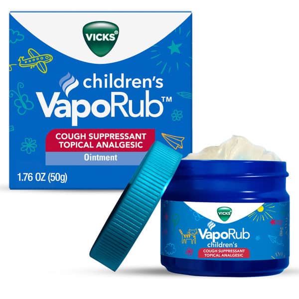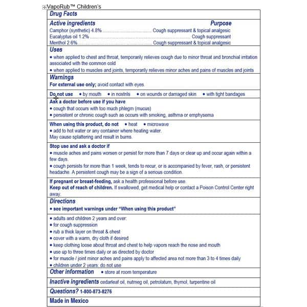 Vicks Children’s VapoRub topical cough suppressant is brought to you by the world’s #1 selling OTC cough and cold brand! Vicks Children’s VapoRub is a topical cough over-the-counter medicine with medicated vapors. It starts working quickly and on contact to relieve your child’s cough symptoms. Vicks Children’s VapoRub can be used on children ages 2 and up. Children’s VapoRub has three active cough suppressants that are clinically proven to relieve coughs: menthol, camphor, and eucalyptus oil. Use to temporarily relieve your child’s cough that may be due to minor throat and bronchial irritation associated with the common cold. Children’s VapoRub can also be used as a topical analgesic to temporarily relieve minor aches and pains in your child’s muscles and joints. To use for cough suppression rub a thick layer on throat and chest, then cover with a warm dry cloth if desired. Keep your child’s clothing loose around throat and chest to allow Vicks vapors to reach the nose and mouth. Use up to three times daily or as directed by a doctor. To use for minor muscle and joint aches and pains apply to affected area not more than three to four times daily.