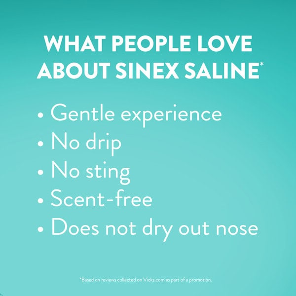 Relief you can trust from Vicks, the world’s #1 selling cough and cold brand! Vicks Sinex, the brand your nose knows and loves, now carries a drug-free saline spray! Instantly clear everyday congestion with Vicks Sinex Saline Ultra Fine Mist Nasal Spray. Helps clear nasal congestion by washing dust, allergens, irritants, and mucus from the nose. Plus it’s safe for daily use because it is drug-free with no added preservatives. It is simply a hypertonic saline solution made with purified water. Its special ultra fine mist spray is designed to deliver gentle yet effective relief! Can be used daily, as often as needed, to treat sinus congestion caused by a cold or seasonal allergy spell. Vicks Sinex Saline is safe to use with over the counter or prescription medicines. For children and adults age 2 or older (with adult supervision): Spray in each nostril and blow your nose as needed to instantly clear your everyday congestion.