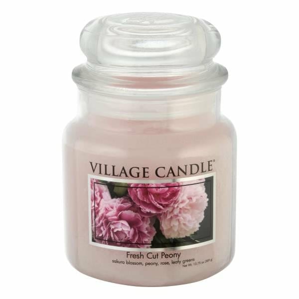 Sakura blossom, peony, rose, leafy greens. Approx. burn time is up to 105 hours. www.villagecandle.com. Made in Wells, Maine USA.