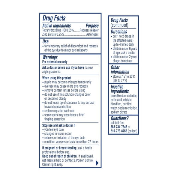 • Active ingredient tetrahydrozoline HCl is a redness reliever designed to provide red eye relief