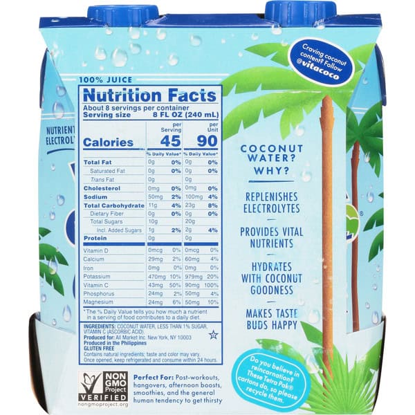 Not from concentrate. Coconut water? Why? Replenishes electrolytes. Provides vital nutrients. Hydrates with coconut goodness. Makes taste buds happy. Contains natural ingredients; taste and color may vary.
