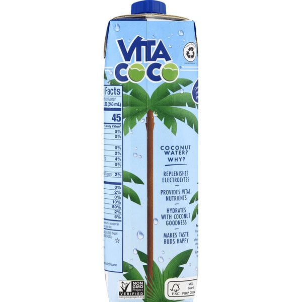 Gluten free. Non GMO Project Verified. nongmoproject.org. Nutrients & electrolytes. Not from concentrate. Our coconuts are carefully handpicked on thousands of small farms throughout the tropics. See how we partner with our farming communities at vitacoco.com. Coconut Water? Why? Replenishes electrolytes. Provides vital nutrients. Hydrates with coconut goodness. Makes taste buds happy. Contains natural ingredients; taste and color may vary. vitacoco.com. recyclecartons.com. Craving coconut content? Follow (at)vitacoco. Protects what’s good. Tetra pak. Tetra pak tetra prisma aseptic. Please recycle. FSC mix board. recyclecartons.com. Do you believe in reincarnation this tetra pak carton does, so please recycle it. Produced in the Philippines.