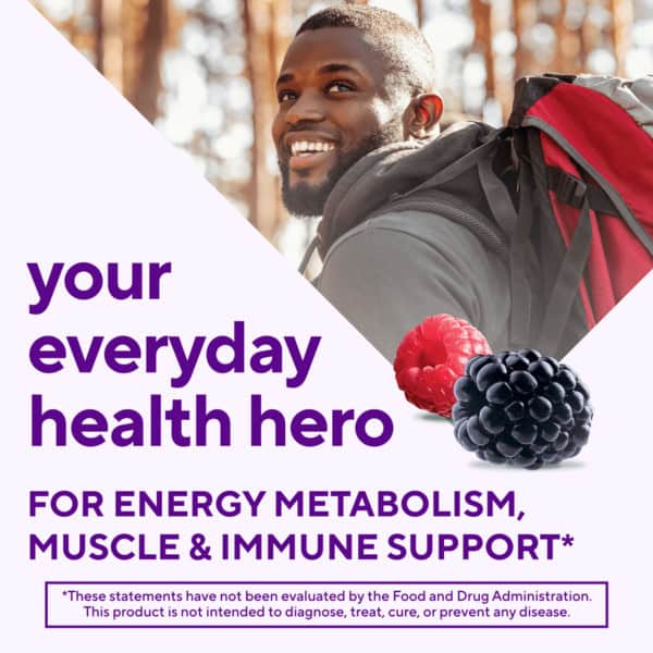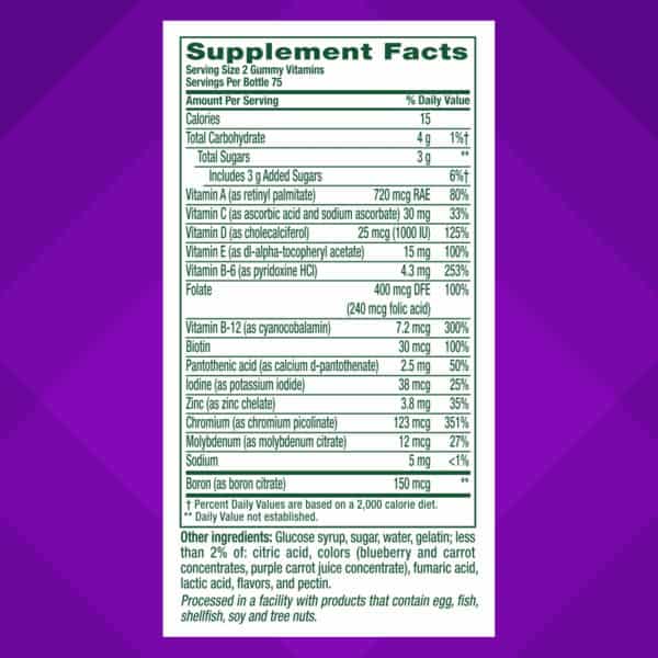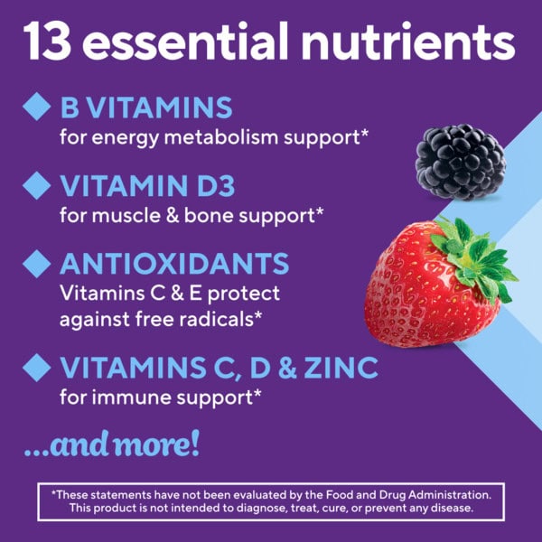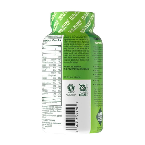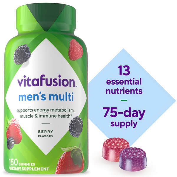 vitafusion Adult Gummy Daily Multivitamins for Men is a daily dietary supplement specially formulated to support the health needs of men. Each delicious serving of vitamin gummies fuses essential vitamins and minerals with natural fruit flavors to provide a great tasting and convenient alternative to traditional, hard-to-swallow vitamin pills. At vitafusion, it is a belief that taste and nutrition can be fused together to deliver the best daily multivitamin experience for men, ensuring that taking your men’s daily multivitamin is an easy and delicious part of your day. Each two-gummy serving supports cellular energy, the immune system, muscles, and energy metabolism (1). They are also an excellent source of Vitamin A, Vitamin C and Vitamin D. These adult gummy vitamins also contain Vitamins E, B-6 and B-12, Biotin, Zinc and Folate per serving. Each flavorful and nutritious men’s multivitamin gummy is made with no artificial flavors or sweeteners, no gluten, no high fructose corn syrup, no dairy and no synthetic FD&C dyes. This 150 count bottle of gummy vitamins ensures you’ll have enough to last you 75 days. vitafusion is the only gummy vitamin brand with products that have been awarded the ChefsBest Excellence award for taste; these Adult Gummy Multivitamins for Men were the recipient of the 2021 ChefsBest Excellence Award (2). Take a fruitful step toward a healthier, happier world with gummy vitamins from vitafusion, the gummy vitamin experts.