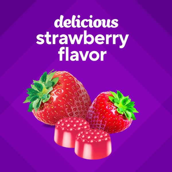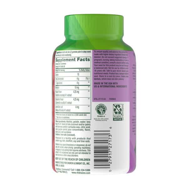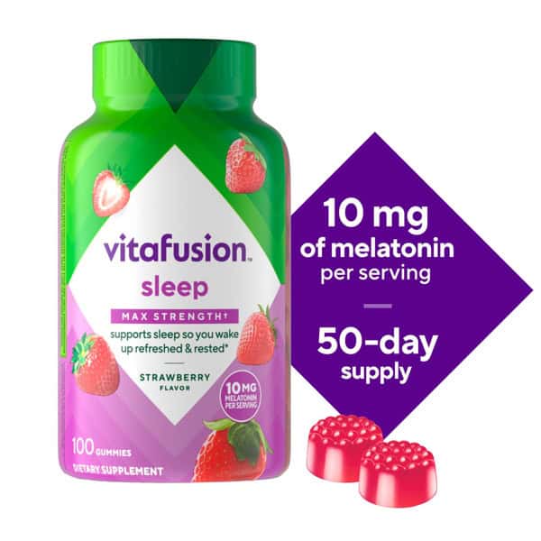 Wake up ready to take on the day with vitafusion Max Strength Melatonin Gummy Supplements, formulated for sleep support (1). It’s a yummy melatonin gummy made with a natural strawberry flavor that helps as a sleep support to help you wake up feeling refreshed (1). Each two-gummy supplement serving supports sleep and helps with jet lag recovery (1). These gummy melatonin supplements are specially formulated to provide 10 mg of melatonin per serving. They also provide a great tasting and convenient alternative to traditional, hard-to-swallow melatonin sleep support pills. Each flavorful melatonin gummy is made with no artificial flavors or sweeteners, no gluten, no high fructose corn syrup, no dairy and no synthetic FD&C dyes. Look forward to your daily dose of melatonin with vitafusion gummies. This 100 count bottle of sleep supplements for adults ensures you’ll have enough to last you 50 days. vitafusion is the only gummy vitamin brand with products that have been awarded the ChefsBest Excellence award for taste; these melatonin gummies were the recipient of the 2021 ChefsBest Excellence Award (2). Take a fruitful step toward a healthier, happier world with vitamins from Vitafusion, the gummy vitamin experts. (1) These statements have not been evaluated by the Food and Drug Administration. This product is not intended to diagnose, treat, cure or prevent any disease. (2) The ChefsBest Excellence Award is awarded to brands that surpass quality standards established by independent professional chefs. Evaluation funded by Church & Dwight Co., Inc.