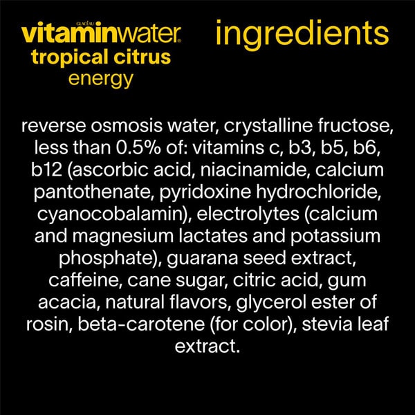 Reverse Osmosis Water, Crystalline Fructose, Cane Sugar, Less Than 0.5% Of: Natural Flavors, Vitamin C (ascorbic Acid), Citric Acid, Gum Acacia, Magnesium Lactate And Calcium Lactate And Potassium Phosphate (electrolyte Sources), Caffeine, Vitamin B3 (niacinamide), Glycerol Ester Of Rosin, Guarana Seed Extract, Vitamin B5 (calcium Pantothenate), Vitamin B6 (pyridoxine Hydrochloride), Beta-carotene (color), Vitamin B12 (cyanocobalamin)