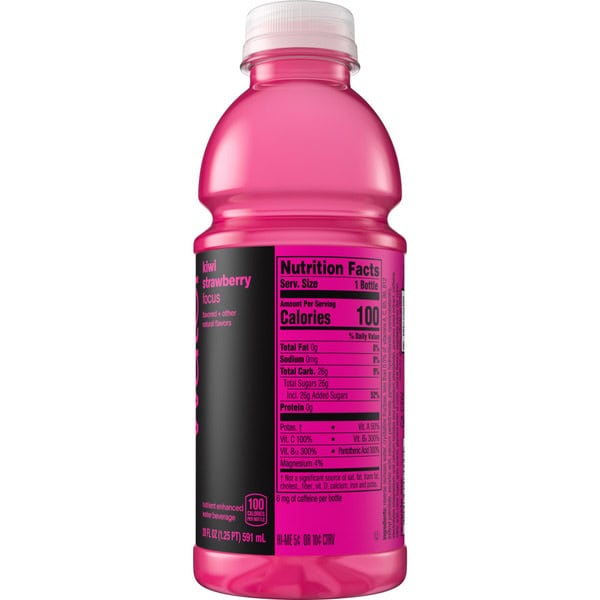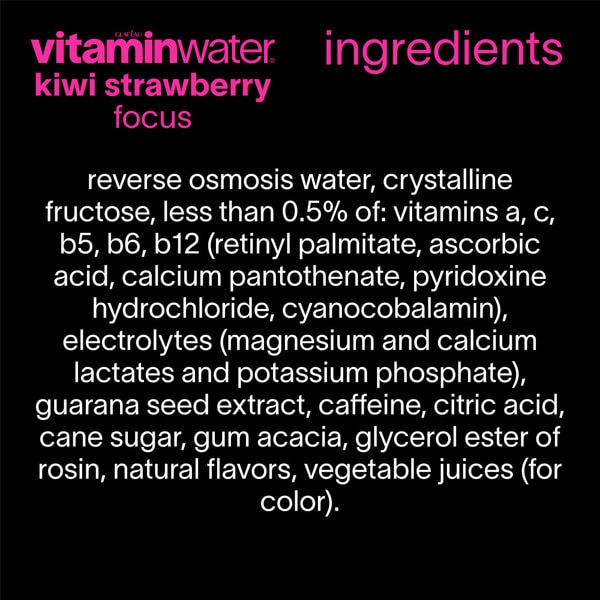 life is complicated. that’s where vitaminwater focus, kiwi strawberry comes in. this nutrient-enhanced drinking water beverage is like a mini vacation in the middle of your busy day but without the overpriced souvenirs. vitaminwater focus has vitamins b5, b6 and b12 to help to support normal neurological function. don’t forget the antioxidant vitamin c, plus added guarana and electrolytes.