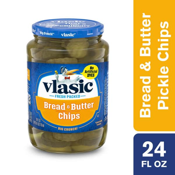 Vlasic Bread and Butter Pickle Chips are deliciously tart with a hint of sweetness. All included ingredients, along with the Vlasic secret pickling recipe, make these bread and butter pickles mildly sweet and tasty. These sandwich pickles contain 15 calories per serving and deliver a one-of-a-kind crunch your entire family will love. Bread and butter pickle chips are ideal for topping hamburgers and sandwiches, or you can enjoy them right out of the jar as a satisfying snack. Vlasic Bread and Butter Chips are fresh-packed in a 24 fluid ounce resealable jar to keep them crunchy and delicious. Vlasic offers several flavors and sizes of pickles, peppers and relish. Keto friendly: 2g net carbs (2g total carbs minus 0g dietary fiber), and 1g added sugar per serving.