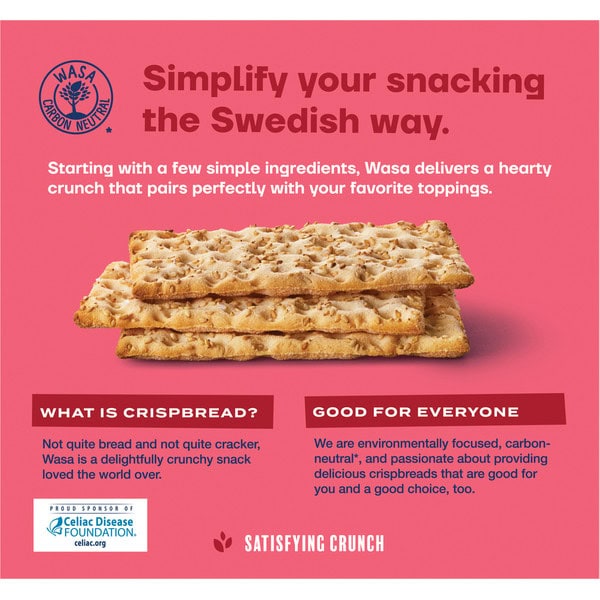 Simplify your snacking the Swedish way. Starting with a few simple ingredients, Wasa Gluten Free Crispbreads deliver a hearty crunch and pair perfectly with your favorite toppings. Much larger than a regular cracker, Wasa Gluten Free Crispbread stands up to any topping for your own culinary creations. These gluten free crispbreads are baked to perfection for a hearty, satisfying crunch! Fat free and good source of fiber. Available in 10 varieties, Wasa Gluten Free Crispbreads are a great substitute for bread or other snack crackers. Anything is Wasa-ble with wholesome oven baked crispbreads.