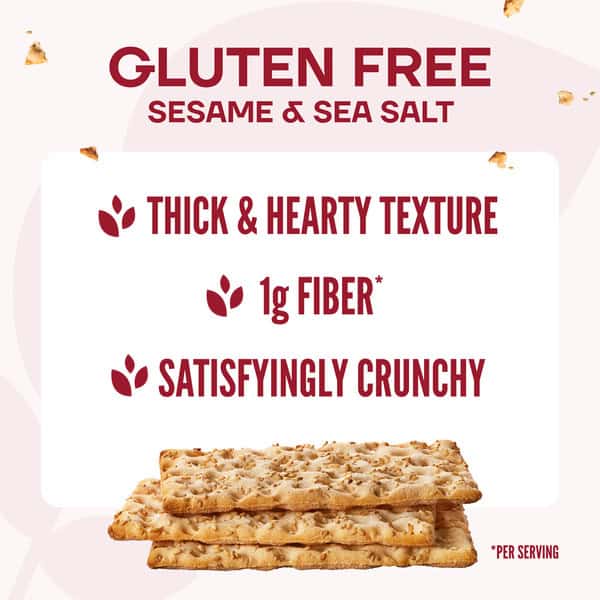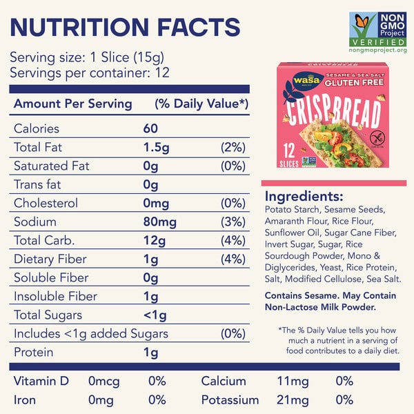 • Wasa Gluten Free Sesame & Sea Salt Crispbread starts with a few simple ingredients and is baked to perfection for a hearty, satisfying crunch – sounds good