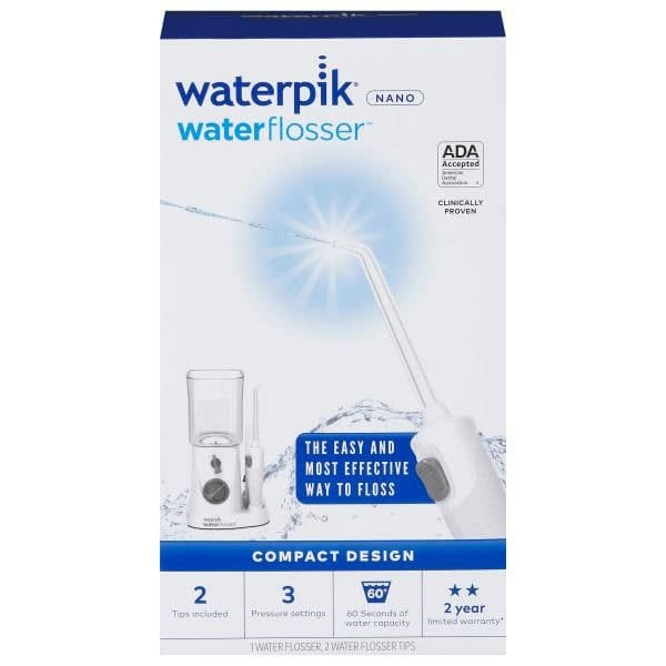 Clinically proven. The easy and most effective way to floss. Compact design. 2 tips included. 3 pressure settings. 60 seconds of water capacity. Healthier gums and brighter teeth in just one minute a day! Reservoir inverts for compact travel size. Quick release tip eject button. On/off switch. Pressure control with 3 settings. 2 Water Flosser Tips: Classic jet tip; general use. Classic white. Clinically Proven: The Waterpik Water Flosser provides a unique combination of water pressure and pulsations to clean deep between teeth and below the gumline, removing harmful bacteria and debris that traditional brushing and flossing can’t reach. Effective Plaque Removal (Independent clinical study. Go to waterpik.com for details) – Removes up to 99.9% of plaque from treated areas. Laboratory study, tooth surface magnified by electron microscope. Healthier Gums (Independent clinical study. Go to waterpik.com for details) – Up to 50% more effective for improving gum health vs. string floss. Note: Actual product may vary from that pictured on carton.