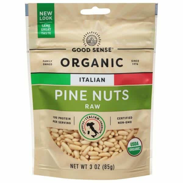 USDA Organic. Certified Organic by International Certification Services, Inc. Non GMO. Great for: salads; pastas; pizzas; entrees! Italian pine nuts, known for their ancient origins back to the ruins of Pompei, were discovered in the Vesuvius area overlooking the city of Naples on Italy’s west coast. Today, these rich, aromatic pine nuts are grown in Southern Italy’s warm, dry climate known for it’s world famous tomatoes, lemons and fruits. In addition to their delicate taste, buttery flavor and refreshing aroma, Italian pine nuts provide more protein than most other nuts or seeds and contain less carbohydrates per serving than most other pine nut varieties. Premium quality Italian pine nuts are commonly used to enhance salads, pastas, rice dishes, pizzas, baked goods, and an array of vegetables. They are an essential ingredient when creating delicious pestos and other sauces. Quality Guaranteed: If you are not satisfied with this product, please send comments, proof of purchase, receipt and your name and address to: Waymouth Farms 5300 Boone Avenue N., New Hope, MN 55428. www.goodsensesnacks.com. Packaged in the USA. Product of Italy.