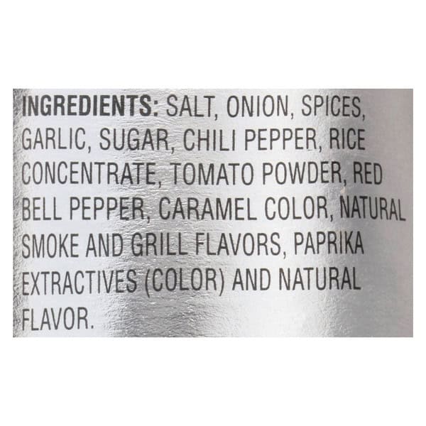 Salt, Onion, Spices, Garlic, Sugar, Chili Pepper, Rice Concentrate, Tomato Powder, Red Bell Pepper, Caramel Color, Natural Smoke And Grill Flavors, Paprika Extractives (color) And Natural Flavor.