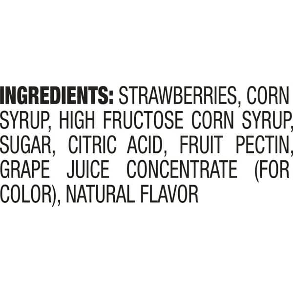 Strawberries, Corn Syrup, High Fructose Corn Syrup, Sugar, Citric Acid, Fruit Pectin, Grape Juice Concentrate (for Color), Natural Flavor