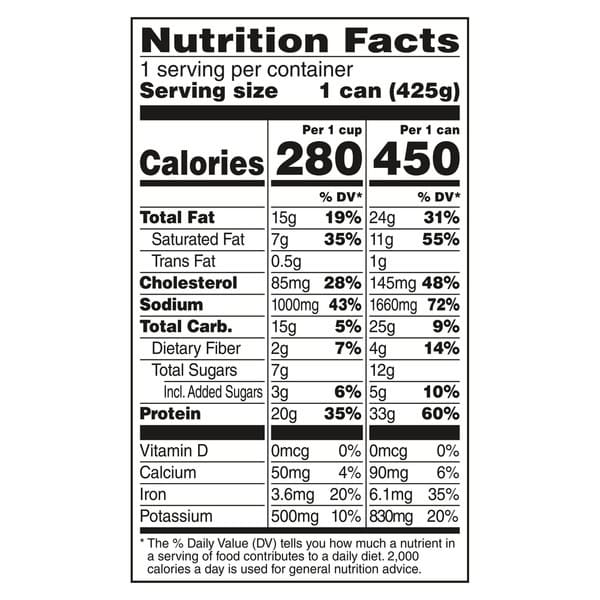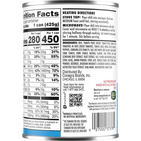 Enjoy the classic taste of Wendy’s Chili from the comfort of your own home with Wendy’s Chili With No Beans. This savory, homestyle canned chili with no beans is inspired by Wendy’s original chili recipe and packed with 30% more beef than our chili with beans.* Savor every bite of our restaurant-quality chili that contains 33 g of protein per can and is made with rich ingredients to provide more savory sauciness through peppers and a comforting tomato-based sauce. If you like to keep tasty, canned foods on hand, then this is the beanless chili for you. It’s easy to store and prepare, making this convenient meal a great option for dinners, lunches and more. Simply heat in the microwave or on the stove and enjoy a comforting bowl of this classic chili meal. Plus, it is made with no preservatives and all natural** beef! Enjoy a delicious bowl of Wendy’s Chili with no beans today!